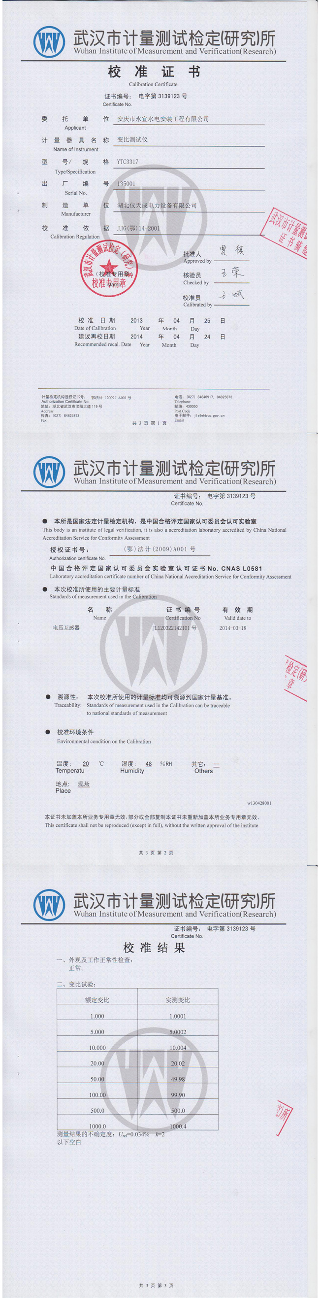 YTC3317全自動(dòng)變比組別測(cè)試儀資質(zhì)證書